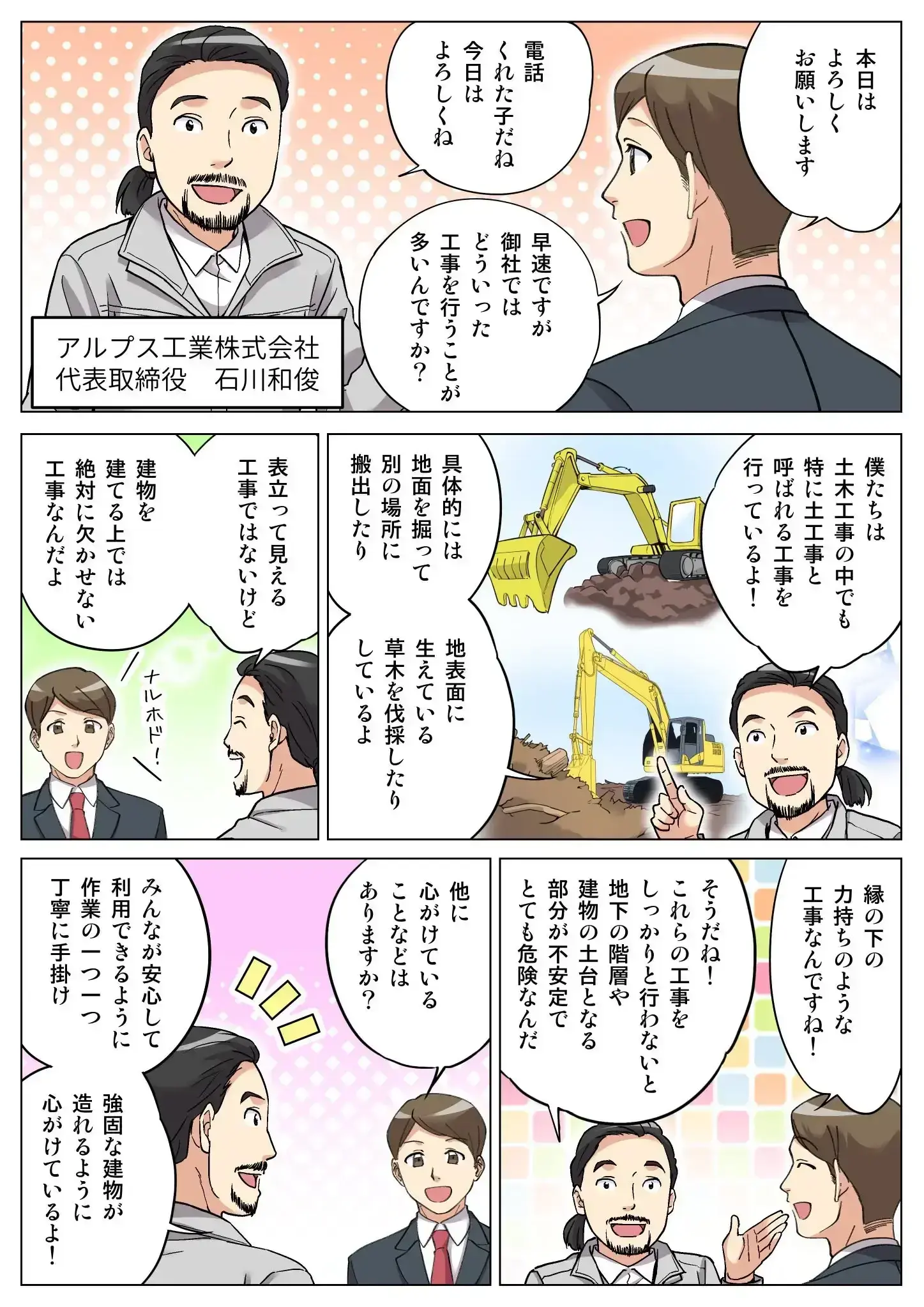 アルプス工業では、建築工事の基礎を作るために必要な土工事を始め、ビルやマンションといった高層建築物を作るために必要な足場・鉄骨を組み上げるとび工事に携わっております。いずれも大変な作業ですが、完成した時には大きなやりがいを感じられる仕事です。
